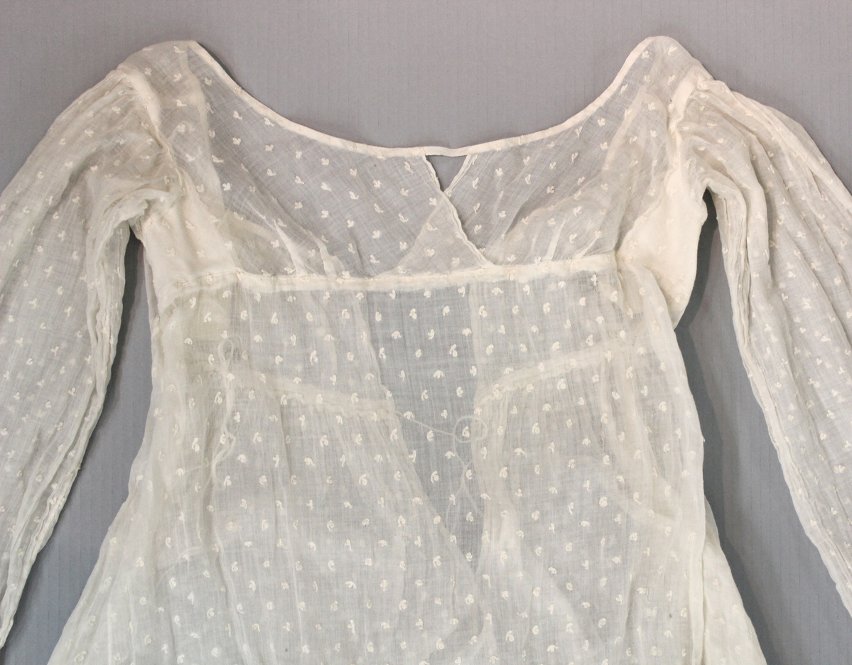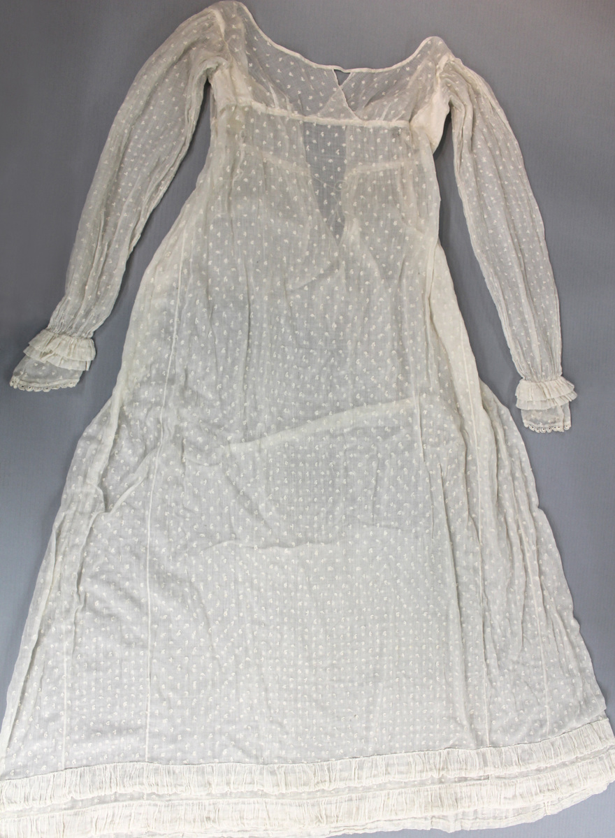 White mull dress, loom embroidered with tiny swirls of white cotton; long sleeves; high waist; two bands of ruching on edge of skirt