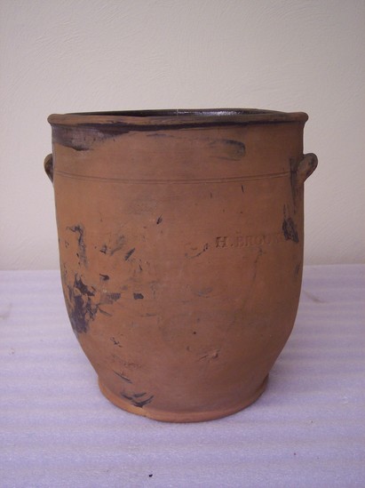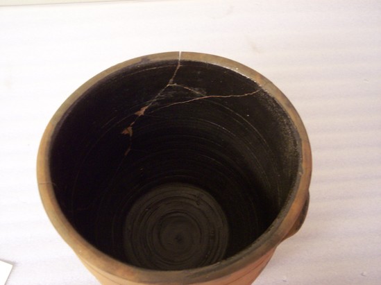 Large red ware pot. Rolled rim and plain base. Ear shaped handle on each side. Interior glazed.