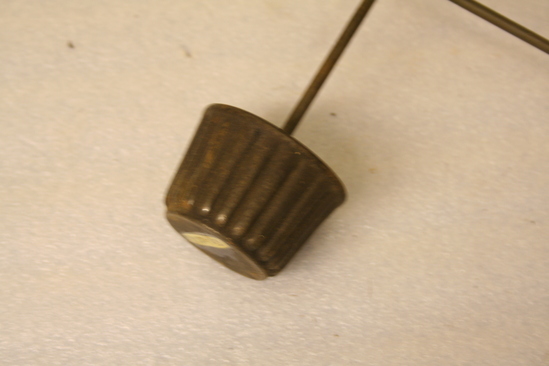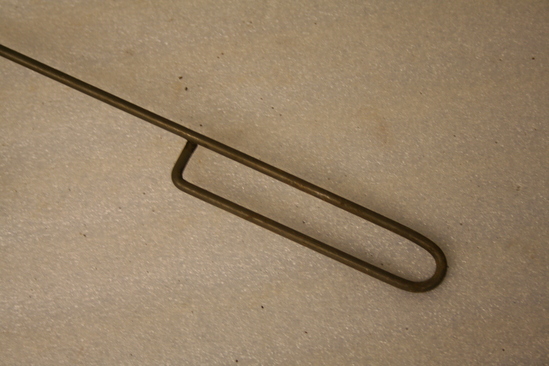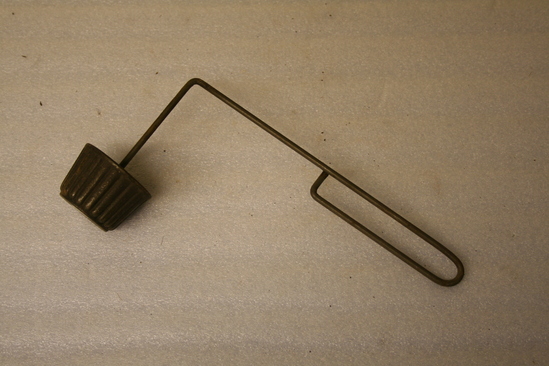Iron timbale maker. Round tin (cupcake shape) with undulating sides. Thin iron handle coming out from center. Tin rotates on handle. Handle bent at 90 degrees. Bends again at bottom creating a long oval loop at end