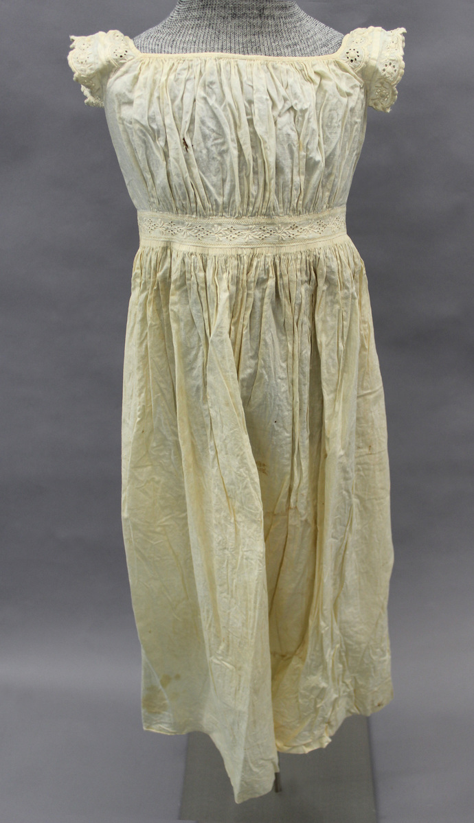 White cotton child's dress; short sleeves of embroidered lace; square neckline; gathered front and back bodice; embroidered lace waistband; drawstrings at neck