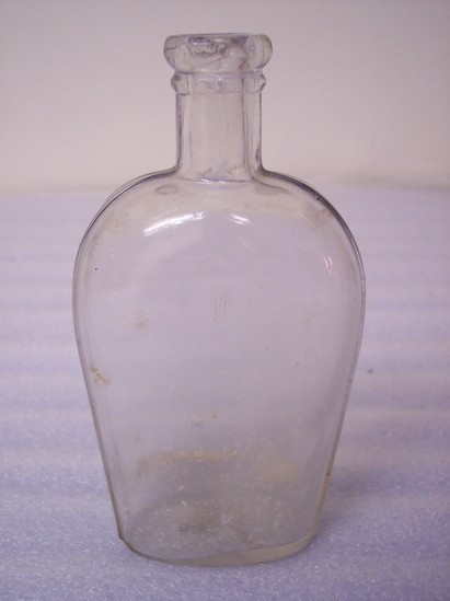 Clear glass bottle - no markings, missing cork stopper. Probably an old liquer bottle. Paper lable taped to the back typed in red "Gift of Crene Curtiss" "10-30-64"
