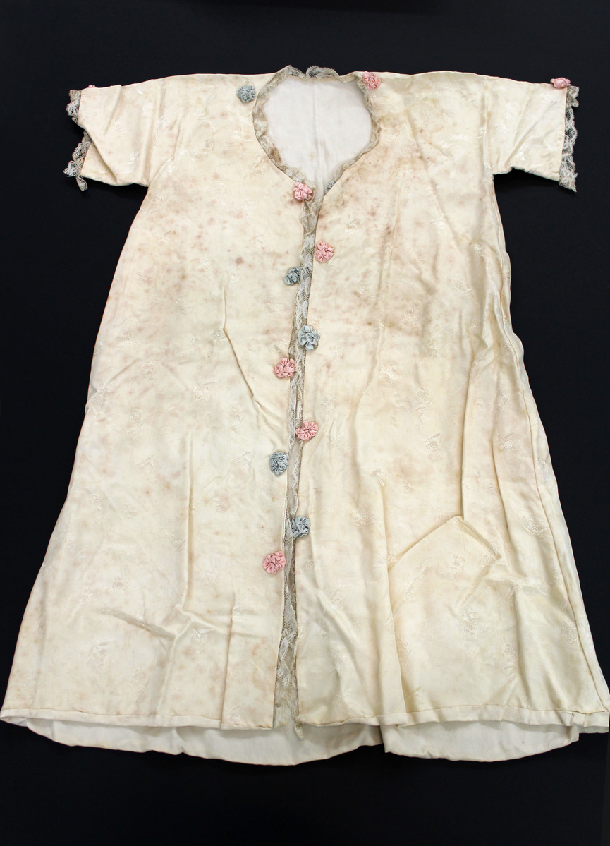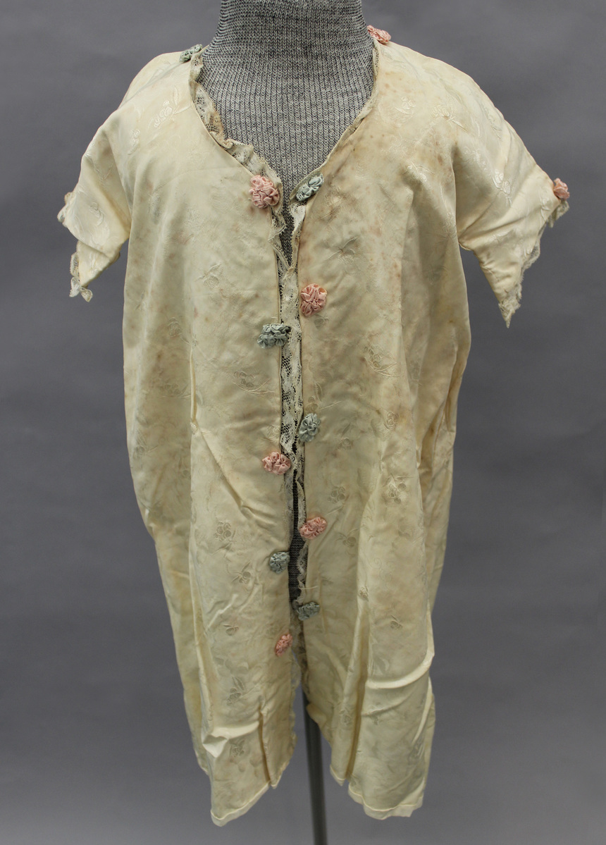 White silk damask child's robe; lined with white silk; short sleeves; round neck; open down front; lace trim along both sides of opening, around neck and sleeves; blue and pink silk rosettes down front along both sides of opening one on each end of sleeve