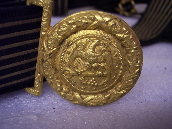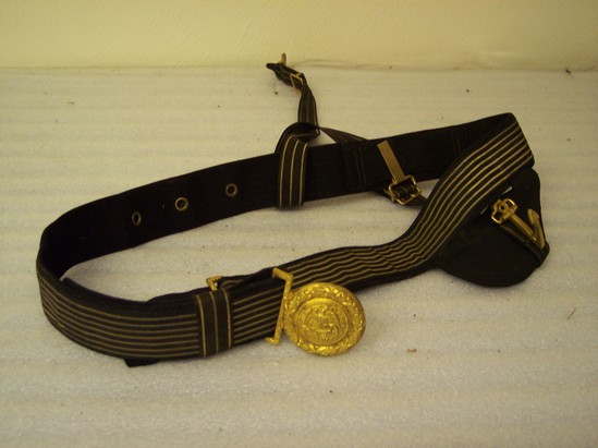 Leather belt, body of belt has dark blue fabric with gold stripes. Round brass buckle stamped with eagle with anchor in talons in a border of stars. Straps on sides of belt to hold sword with brass hardware. One piece in shape of an anchor
