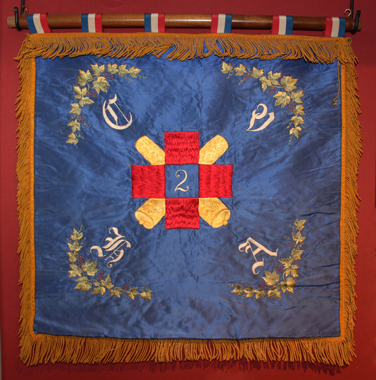 Banner made of blue silk. Six red and white and blue ribbon loops across top of banner. Bordered with gold rope fringe. Front of banner embroidered with four grape clusters in corners, with "C", "V", "H", and "A" embroidered in each of the four corners below the grape clusters. Red cross embroidered in center with a "2" embroidered in white in center. Two embroidered gold cannons embroidered crossing diagonally behind the red cross. Banner is backed in purple silk. Banner accompany by original wooden storage case. Case is rectangular with two hooks to secure a hinged top. Front of the case has stamped brass bail handle and a keyhole. Wooden pole for hanging banner inside case.