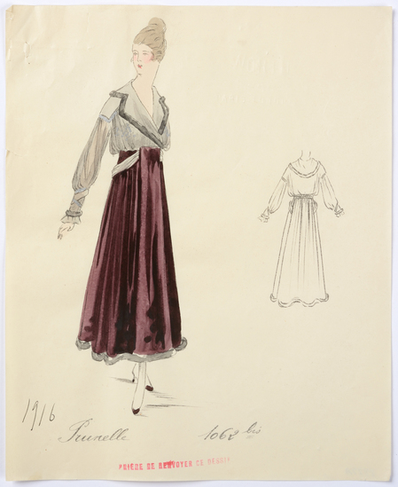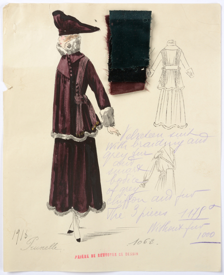 Lithograph and watercolor on paper fashion designs. Velveteen suit with braiding and gray fur. Bodice of gray chiffon and fur. Fabric samples accompany rendering.
