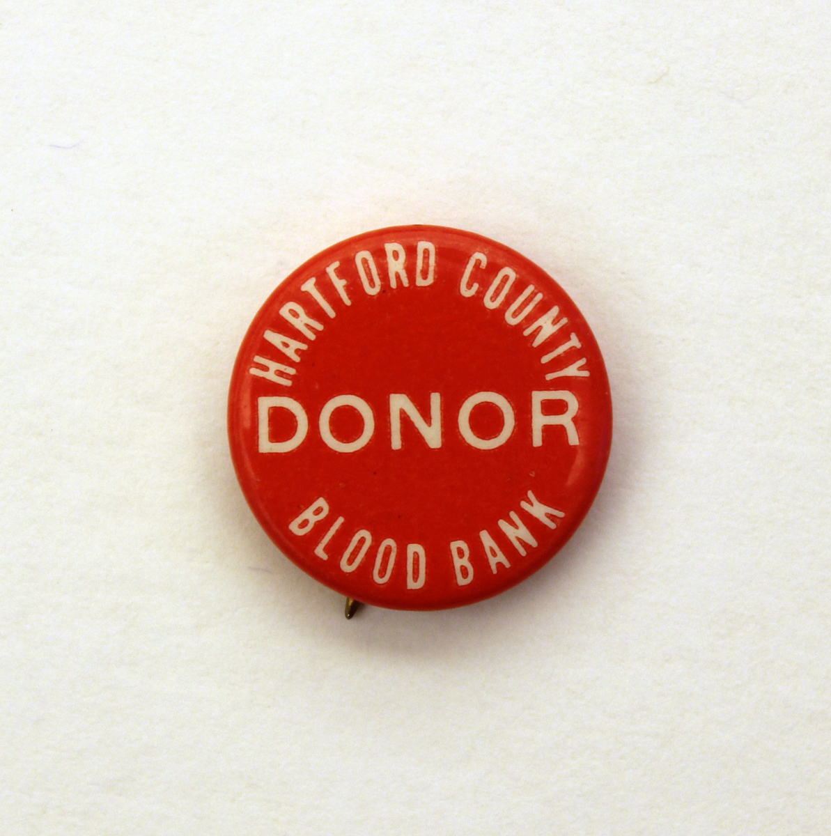 Round metal button with straight pin on reverse. Printed celluloid front with red background and white lettering, "HARTFORD COUNTY/DONOR/BLOOD BANK." Paper label inserted on reverse with manufacturer's information.