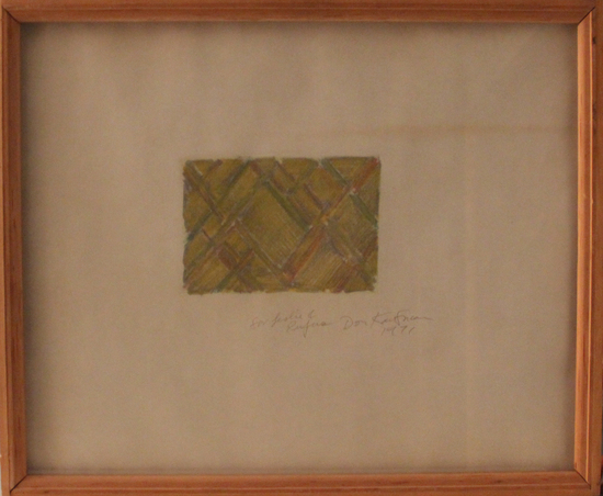 Pastel on muted gold background with cross hatching done in greens and rust shades. Work is centered on a large sheet of white paper. Possibly a trial sketch for Kaufman's "Plate" (1973-19-0). Written below the artwork is "For Leslie and Rufus/ Don Kaufman/ 1971".