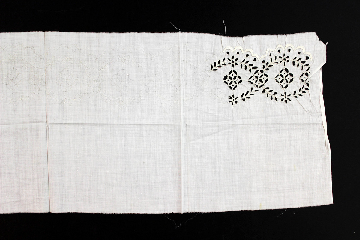 Textile fragment of eyelet embroidery work. Linen fragment with upper half containing pattern of swags, balls, leaves, and circles, all outlined in thread. Ten sections of pattern outlined; the first and most of the second have been worked to completion.
