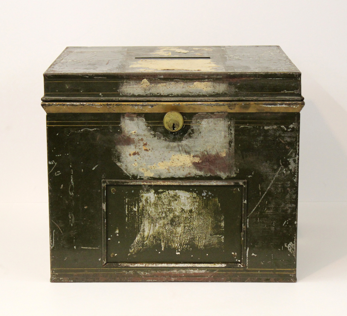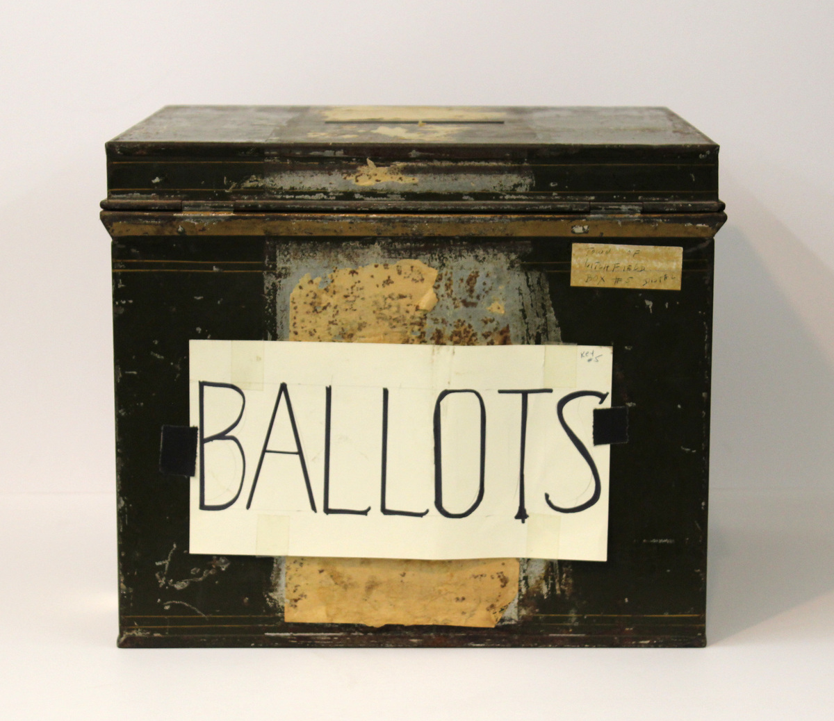 Square metal ballot box, painted green with thin gold lines decorating the edges. Hinged lid that locks at front, with round brass lock made by the Yale brand. Box flares out slightly where base meets lid, and is decorated with a painted gold band. Narrow slot cut in center of lid. Thin metal frame attached to front of box for inserting label; rounded metal handles attached at either side. Affixed on reverse are two labels: a small adhesive label with text "TOWN OF/LITCHFIELD/BOX #5 DIST #2" and a large piece of white paper with text "BALLOTS" in black marker, attached with black tape.