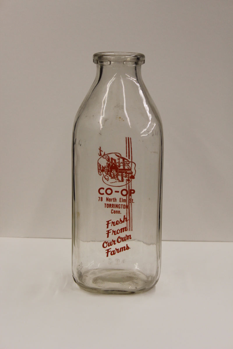 Glass milk bottle with round lip top, circular bottom and relatively-square sides. Printed in red on the front is an image of a small farm. Below the farm, also in red, is "Co-Op/78 North Elm St./Torrington/Conn./Fresh From Our Own Farms." On the back of the bottle, printed in red, are three vertical lines and the words "Finest Dairy." Impressed into bottom edge of the bottle is "Reg./Sealed C NO," and impressed into the bottom of the bottle is "2247 71 23."