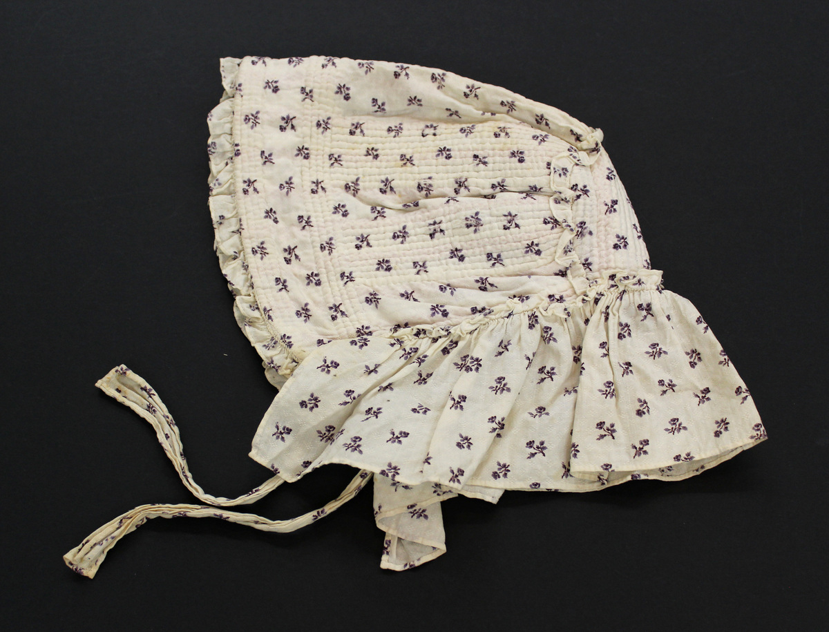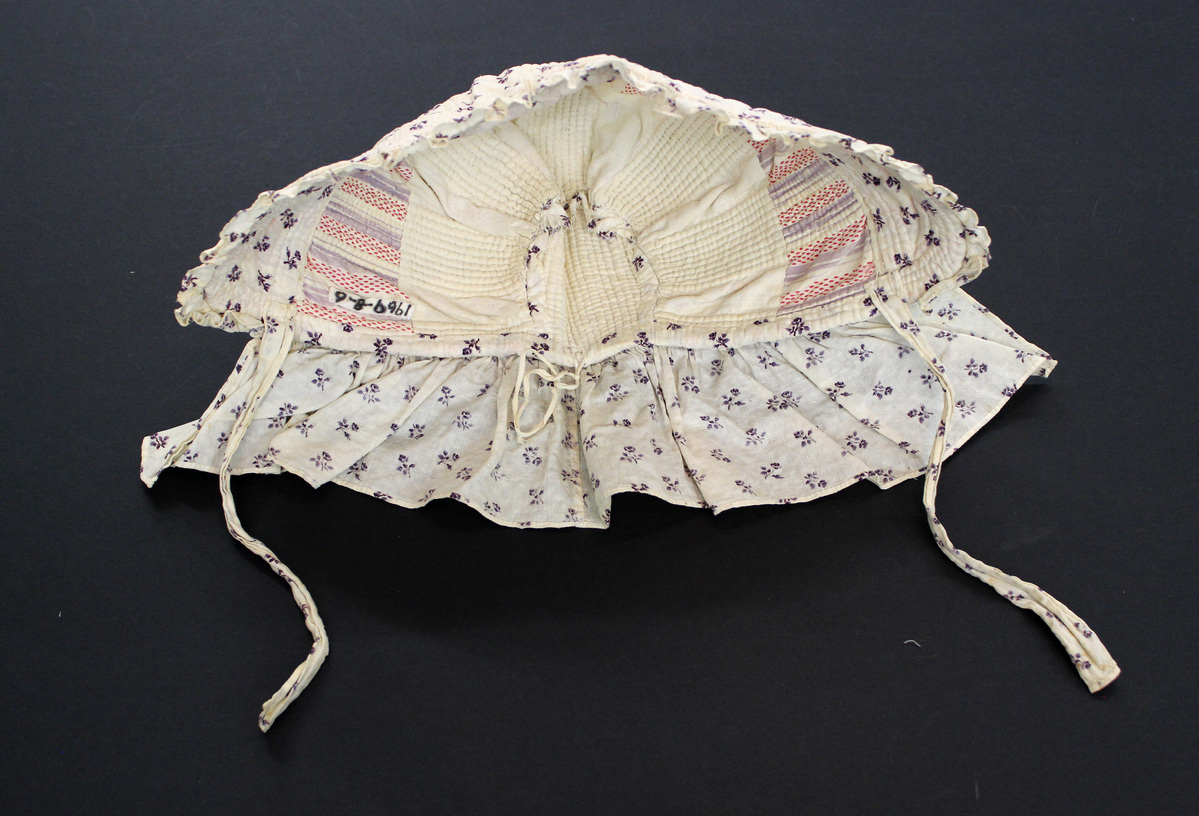 Off-white patterned cotton calico child's sunbonnet; printed purple floral design; corded quilting; ruffle at front edge; neck ruffle; center back quilted section with neck ruffle; fabric ties; lined with matching calico fabric, dark pink and lavender striped cotton and plain muslin; strings for fit adjustment at center back inside