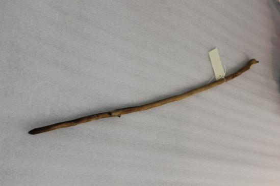 walking stick; shaft, handle, and tip from one piece of wood; rustic; handle has been carved in a rough head of a bird; clusters of hatch marks on the top third of the shaft