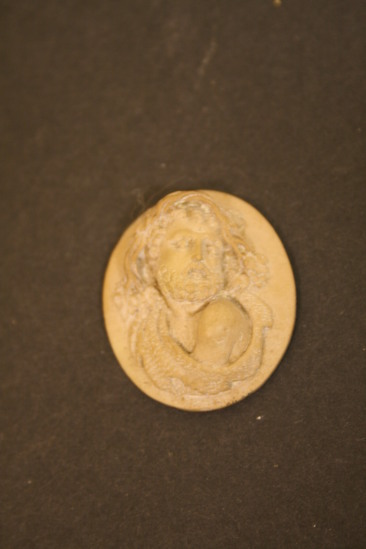 Small brown circular cameo carved from lava rock. Cameo features a raised relief image of a man. Man has long hair and full beard. A wreath adorns his head and he is shown wearing a tunic.