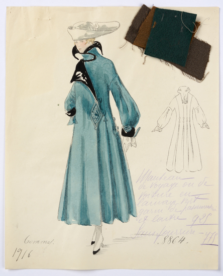 Lithograph and watercolor on paper fashion design. Travel or carriage coat in green wool decorated with otter fur and lace. Fabric samples accompany the rendering.