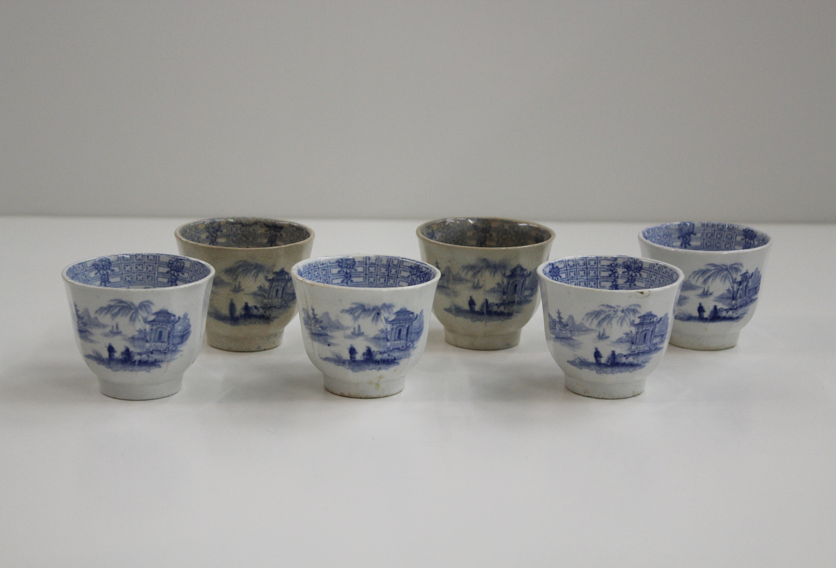 Glazed earthenware teacups used as a toys or play teaware. White ceramic, handleless teacups with blue transfer-printed decoration on interior and exterior. Exterior has two identical scenes showing two figures standing in the foreground of an Asian-inspired landscape with two pagodas and a ship. Interior has a pagoda at the center of the bowl and lattice and floral patterns around rim. E and F are finished in a brown crackled glaze, but have identical decoration. The six cups match the creamer (2016-52-26) and sugar bowl (2016-52-27 a,b).