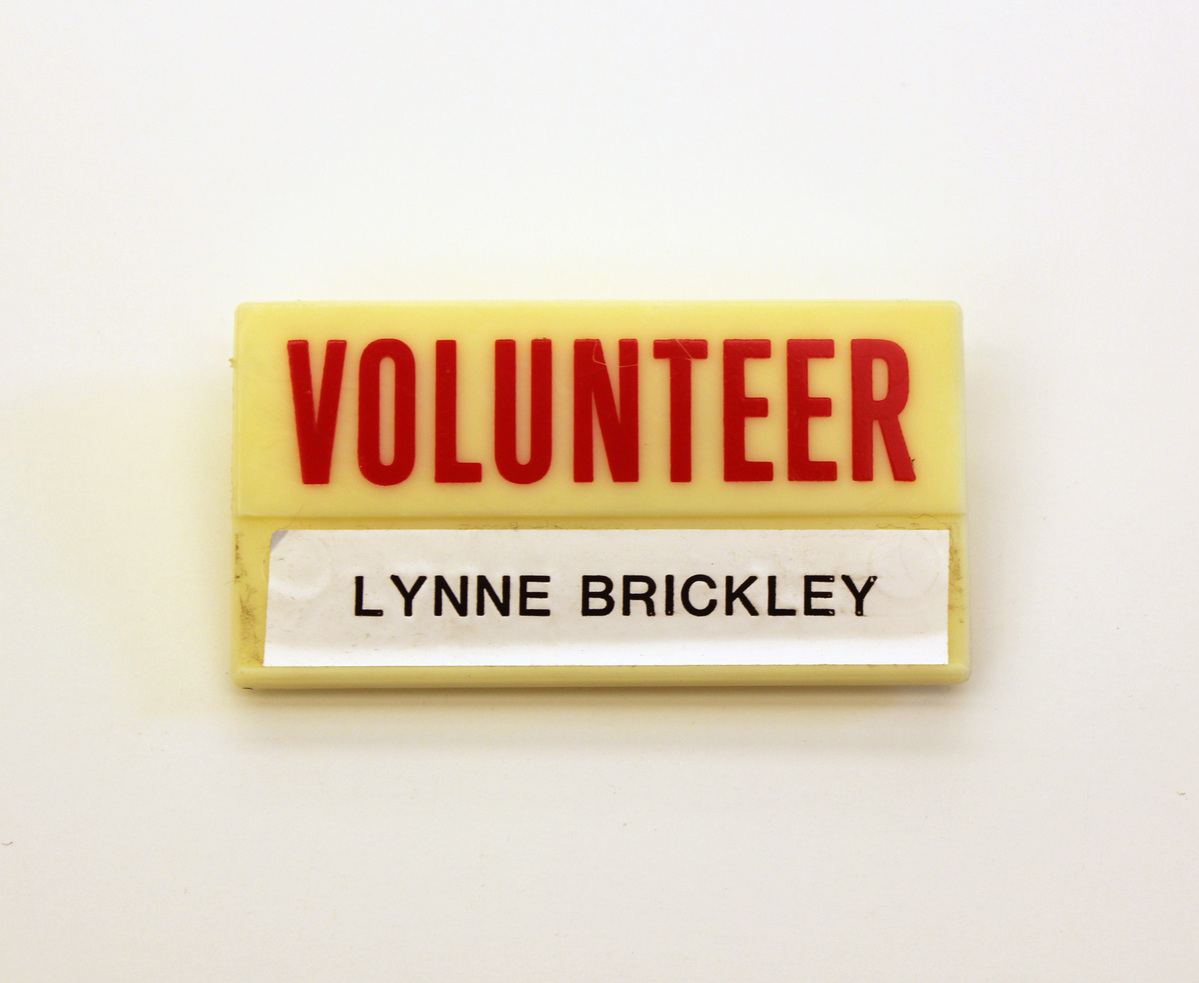 Rectangular plastic name tag. White plastic tag (yellowed) with printed red lettering, "VOLUNTEER." Recessed area below, with rectangular white sticker with black lettering, "LYNNE BRICKLEY." Plastic tab and metal clasp with pin attached to reverse.