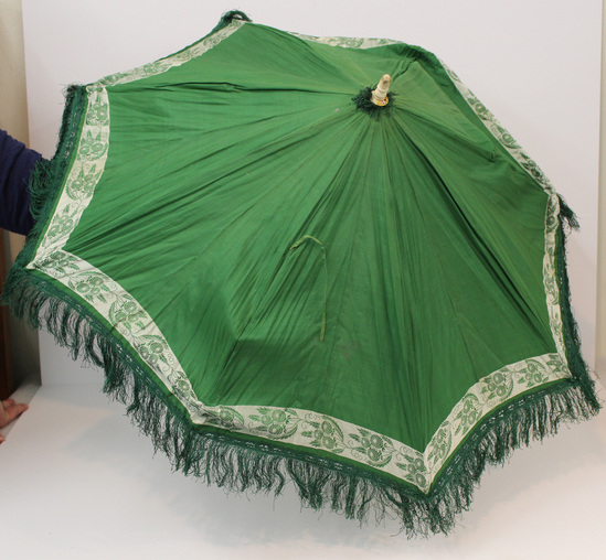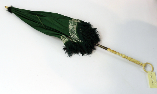 Parasol; folding; kelly green silk with compound weave border pattern in white and green chrysanthemums and leaves; long green silk fringe at base of cover and below ferrule; ivory ferrule with knob at top with incised lines; metal tube; long ivory handle with serpentine turning and knobs with large moveable ring at bottom