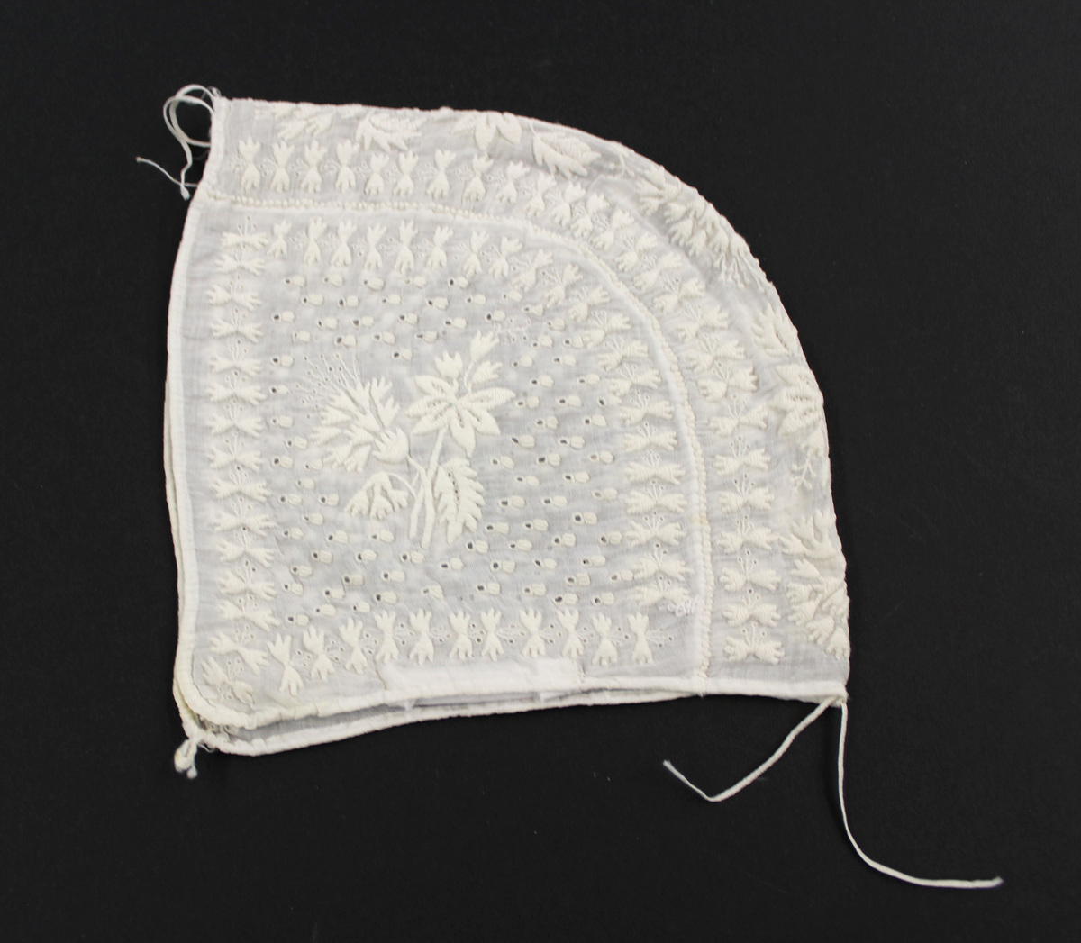 White sheer cotton child's bonnet; all-over white work embroidery; drawstrings at top and neck; no ties