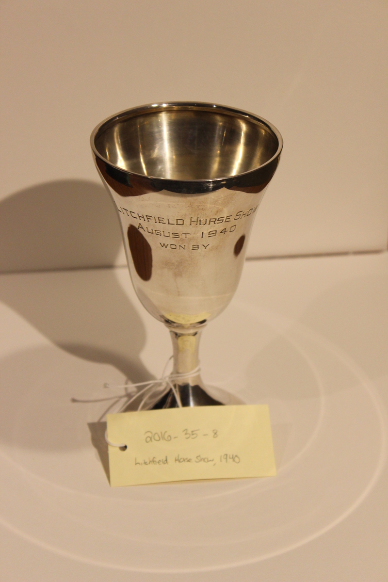 Sterling silver goblet-style trophy awarded for individual class competition at the Litchfield Horse Show in 1940. Engraved on front "LITCHFIELD HORSE SHOW/AUGUST 1940/WON BY." Engraved on bottom STERLING."