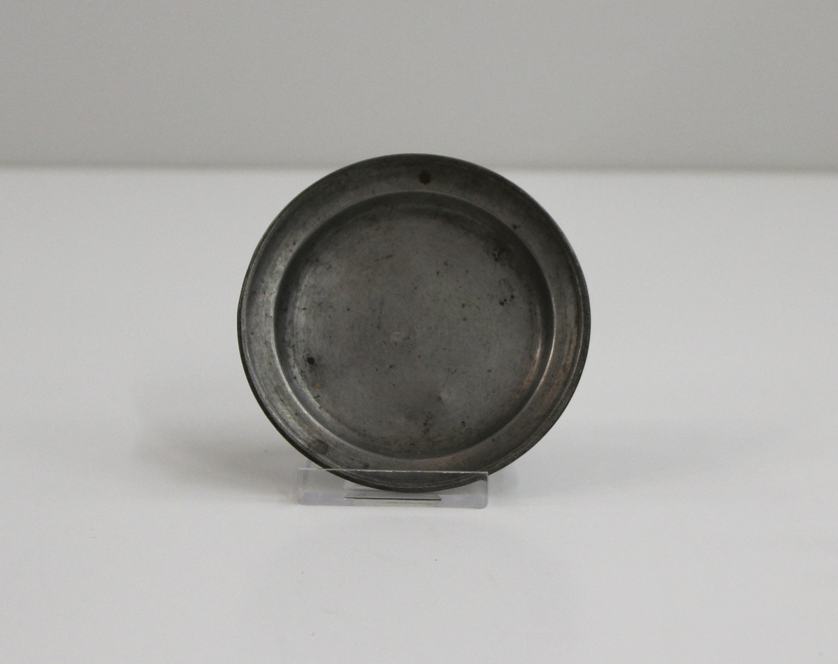 Shallow pewter dish used as toy or child's play dish. Narrow rim, no markings on bottom.