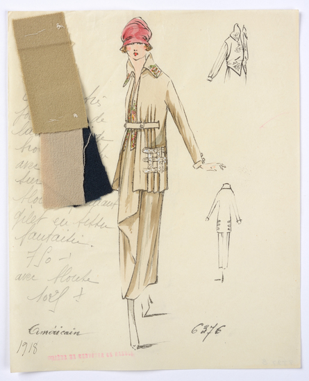 Lithograph and watercolor on paper fashion design. Tailored suit of soft beige wool. Shirt with drape on the front and blouse with vest in fantasy fabric. Fabric samples accompany rendering.