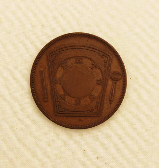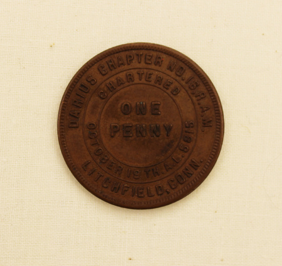 Commemorative masonic coin. Front of coin stamped with masonic images. Back of coin reads, "DARIUS CHAPTER NO. 16, R.A.M./ CHARTERED/ OCTOBER 19TH. A.L. 5815/ LITCHFIELD, CONN." "ONE PENNY" stamped in center.