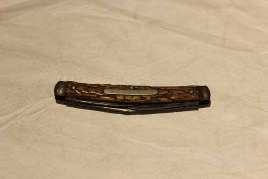 Pocket knife with antler handle and four interior blades or tools. There is a 1.125" metal decorative strip present on one side of the antler handle, marked with a number of vertical incisions or scratches, some in the shape of an "M." Three metal pins hold the antler decorations to the metal frame.