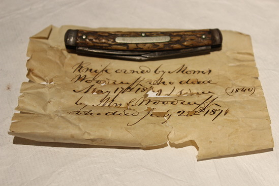 Knife was donated with a handwritten note reading, "Knife owned by Morris Woodruff, who died May 17th 1840, and since by Mrs. C. Woodruff who died July 22 1871." Mrs. C. Woodruff refers to Candace Catlin, who married Morris Woodruff in November 1804.