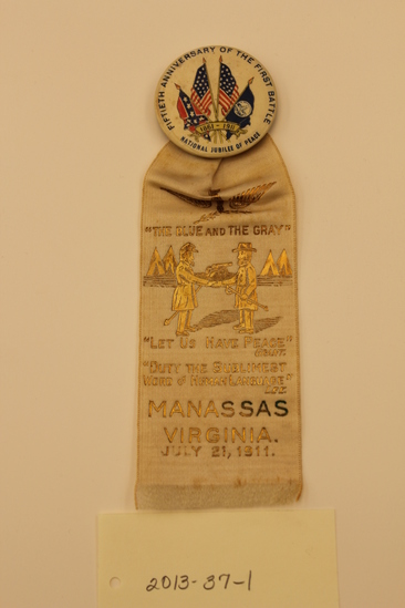 G.A.R. 50th anniversary of Manassas pin. Large round pin with an ivory satin ribbon gathered into the back. Gold printing on ribbon: "(image of dove behind laurel branch) / "THE BLUE AND THE GREY" / "LET US HAVE PEACE" - GRANT / "DUTY THE SUBLIMEST WORD OF HUMAN LANGUAGE" - LEE / MANASSAS / VIRGINIA. / JULY 21, 1911." Printing on pin: "FIFTIETH ANNIVERSARY OF THE FIRST BATTLE / NATION\L JUBILEE OF PEACE." with two American flags, a Confederate flag and an unknown flag. Printed paper label behind pin.