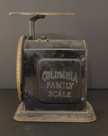 Early twentieth century Landers, Frary and Clark kitchen scale. Metal body painted black. "COLUMBIA FAMILY SCALE" stenciled in gold on sides of body. Circular weight measurement face on front. Center of face painted white with black numbers. "COLUMBIA FAMILY SCALE/ 24 POUNDS BY OZS/ WARRANTED/ LANDER'S, FRARY & CLARK/ NEW BRITAIN, CONN. U.S.A" in center of face with a black indicator hand. Outside of face trimmed with a gold and black decorative border. Circular plate to set item for weighing on top.