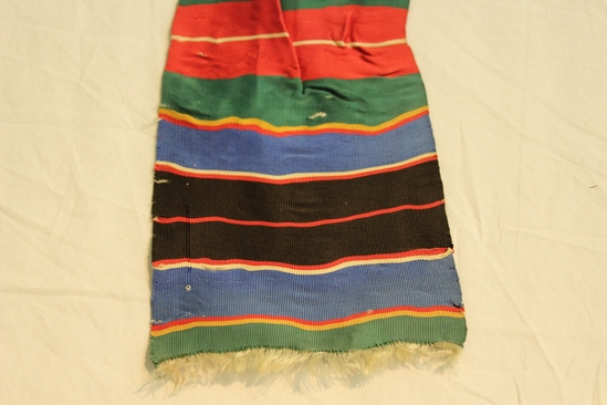 Scarf, silk; short white fringe at two ends; repeating pattern of vertical lines of various thickness; colors - black, red, blue, green, and white