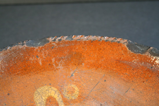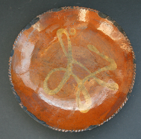 Redware pottery plate with yellow slip decoration