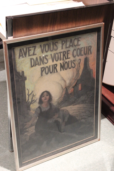 Pastel on paper study for a World War I era poster. Image of a bilious sky with a burning village in the background and young girl in Dutch clogs and strap dress holding a boy in a white shirt in the foreground. "AVEZ VOUS PLACE/ DANS VOTRE COEUR/ POUR NOUS?" in black lettering at top.