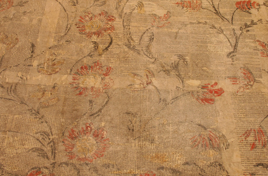 3 pieces of free hand wall design adhered to the back of 1857 edition of the New York Herald Tribune. Grey plaster ground with black vertical meandering vine with large daisy like flowers with orange or madder and black petals, mustard color centers, either side, vines with unidentifiable flowers only in the orange and black. From the Amos Galpin House, West Street, built 1786, removed 1912 when Mrs. Van Lear redecorated.