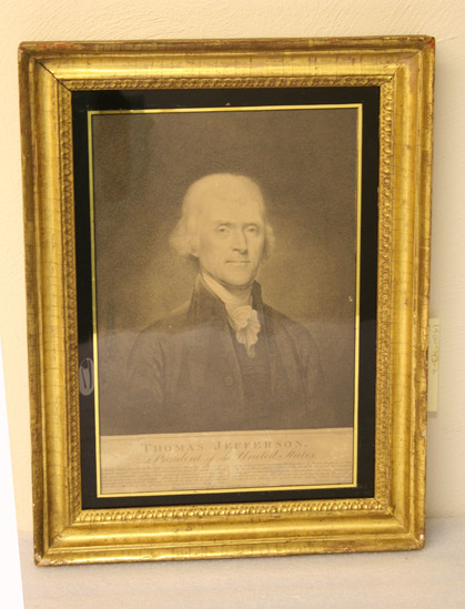 Stipple line engraving bust portrait of Thomas Jefferson, border of black and gold reverse painting on glass. gilt molded wood frame, Title below: "Thomas Jefferson / President of the United States / " with excerpt from the Declaraton of Independence, , above "Philadelphia, Published by M. Carcy No 118 Market St Feb 20, 1801 Copyright Secured"
