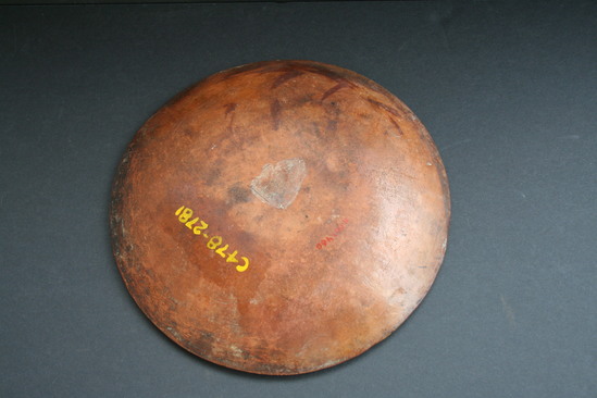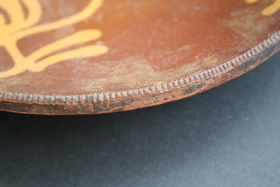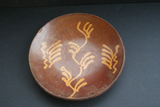 CHOCOLATE BROWN GLAZE WITH YELLOW SLIP LINE DESIGN, RATHER LIKE A VINE. INCISED OR NOTCHED DECORATION ALL ALONG THE EDGE. SLOPING SIDES.
