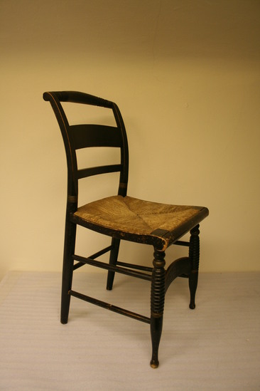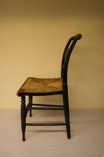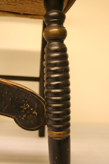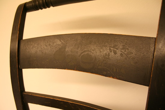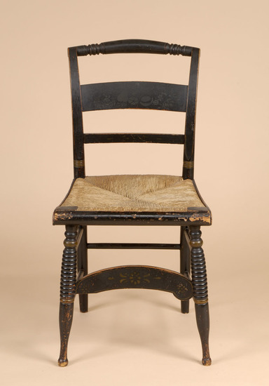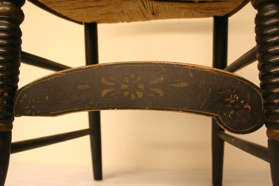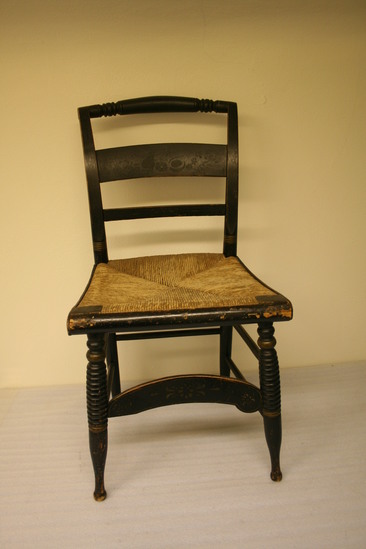 Black slat-back bolster-top Hitchcock-type chair with rush seat. Turned legs and rail, flat stretcher in front. Stenciled design on back rails and on front of stretcher.