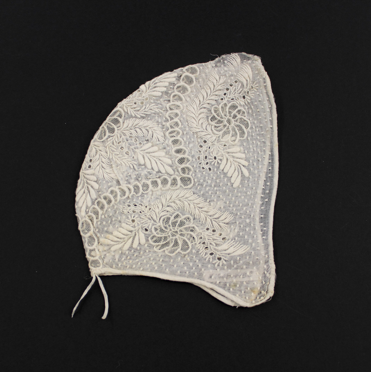Off-white overall white work floral embroidery with net fillings; drawstrings at center back.