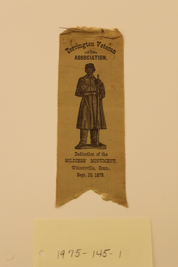 Ivory grosgrain G.A.R. ribbon. Black printing: "Torrington Veteran / Association / (image of a uniformed Civil War soldier with gun) / Dedication of the / SOLDIERS' MONUMENT. / Wolcottville, Conn., / Sept. 10, 1879." Straight top with Inverted V bottom.