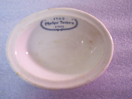 Oval soap dish of plain white with a flat rim. Marked in green "1782/Phelps Tavern/1911" surrounded by a green garland.