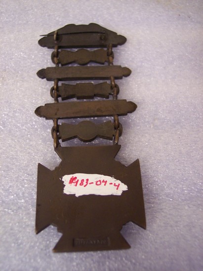 Metal medal. Iron cross at bottom with design of laurel branches. Shield in center. Printed around shield "Small Arms Practice" Attached above cross are 6 separate bars - all of same metal. Top one has image of eagle and word "Marksman", one underneath shaped like a bow tie with "YE 3 AR" printed on it. One underneath oval bar "Sharpshooter" One underneath shaped like a bow tie with "2" printed on it. One underneath is an oval bar with "Expert" imprinted on it. Bottom one shaped like a bow tie with "1" printed in center.