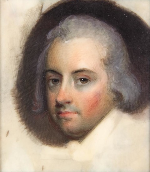 Unfinished miniature on a rectangular piece of ivory. Head in upper right and the pencil sketch of tie and shoulders are indicated below. Subject faces slightly to left; wig and costume about 1800.