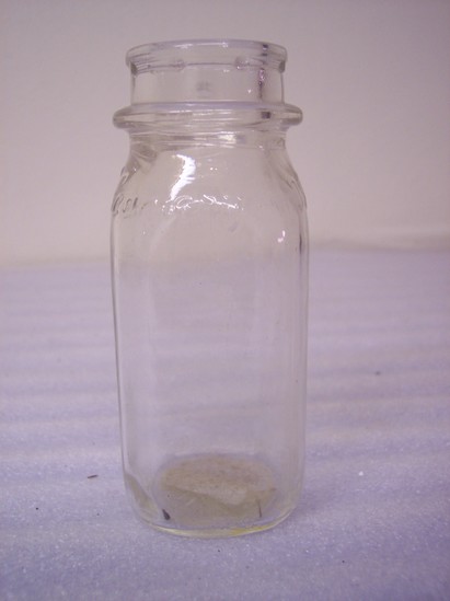 Clear squared bottle, half pint. Probably used for cream. Embossed across shoulders, "Torrington Creamery" on bottom sides, "Half Pint Liq. 331 1 Reg. Sealed mTc S" On bottom "E 56 II" No cover, was probably of paper