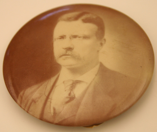 Round metal button with pin on back. Photo of Teddy Roosevelt on front in sepia tones with plastic cover