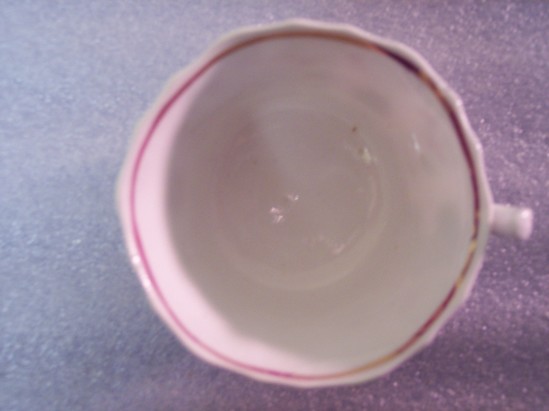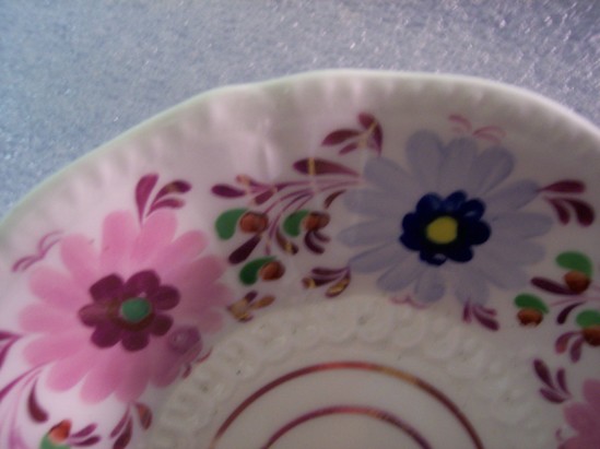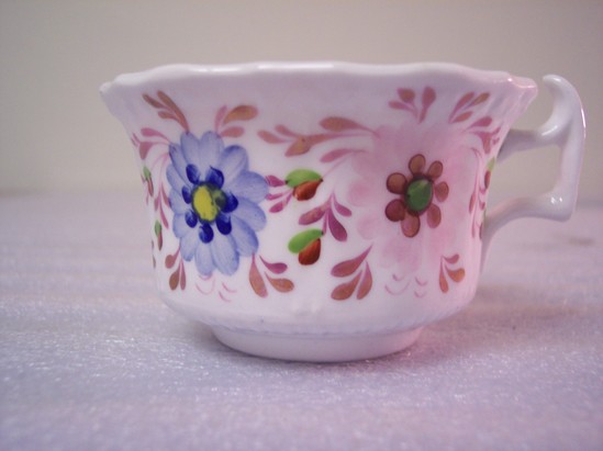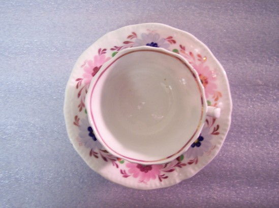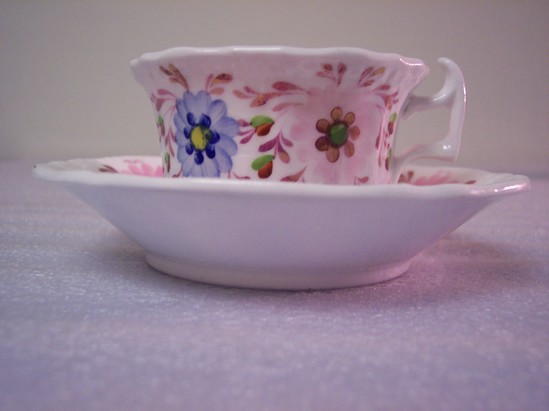 Saucer (B): Round with lobate edge, dot rim, and dot and gadroon around the center. Sides decorated with alternating pink and blue flowers with purple luster leaves and orange buds with green leaves. Flared sides. Cup (A): Wide, flared-lip teacup with segmented squared handle and a round, ring base. Paneled sides with blue and pink floral motif. Pink luster accents.