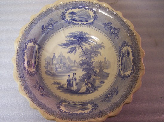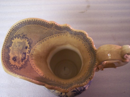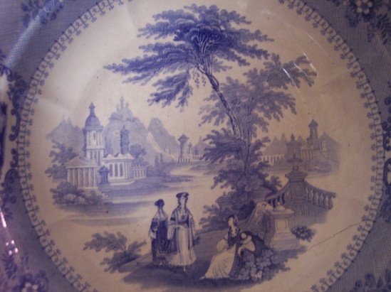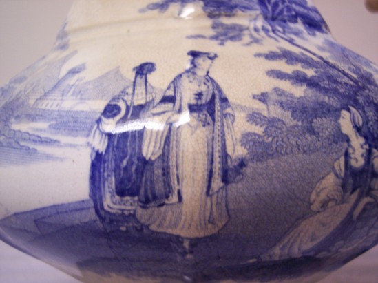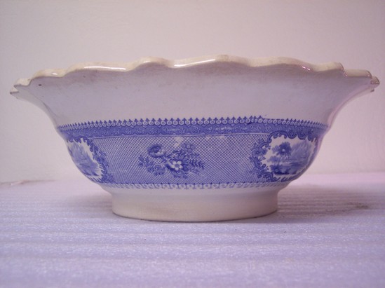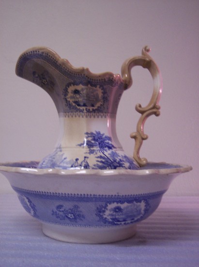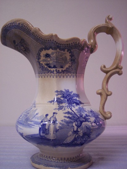Blue transfer-printed designs: Scenes of classical lands and floral sprays in blue and white. Complex background. Rococco edge on basin, pitcher has lobate body, prounounced spout and double cyma curved handle.