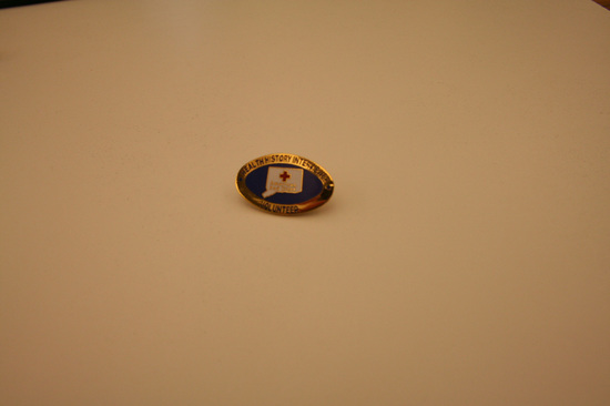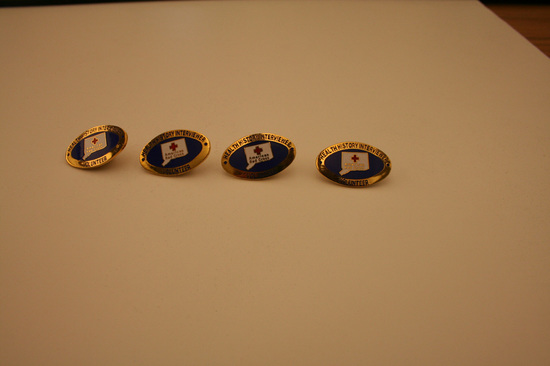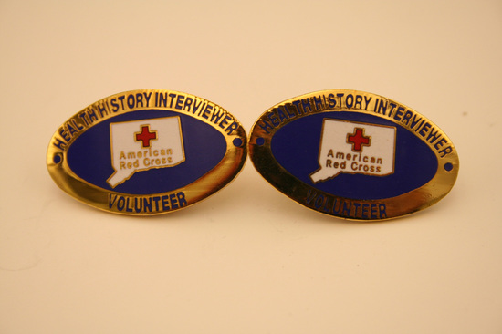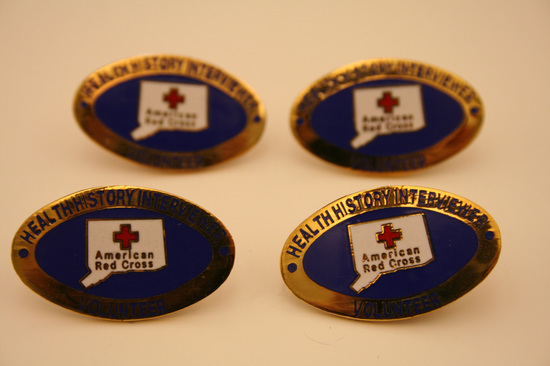 4 Gold metal oval pins. Pin mounted in center of back of bar pin. Clasp fixed over pin. Front of pin has gold border with words "Heath History Interviewer" in blue lettering. Center of pin blue. Outline of state of Connecticut in center with red cross in center state. Underneath cross in gold lettering "American Red Cross".