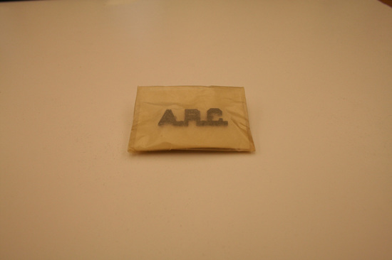Black American Red Cross metal pin in shape of three letters "A.R.C."; two clasps on back. Pin currently attached to rectangular piece of cardboard and found in original wax paper envelope.