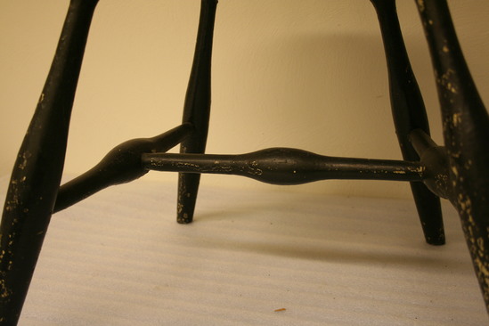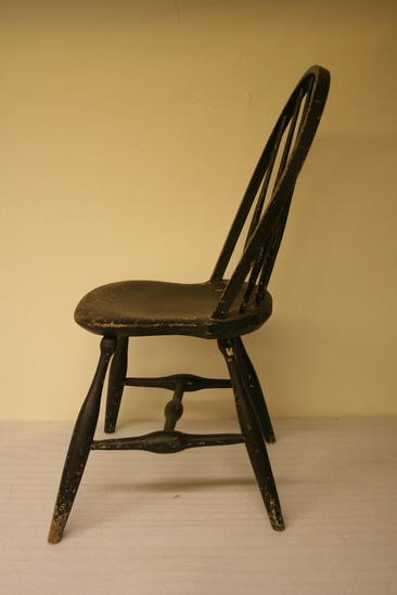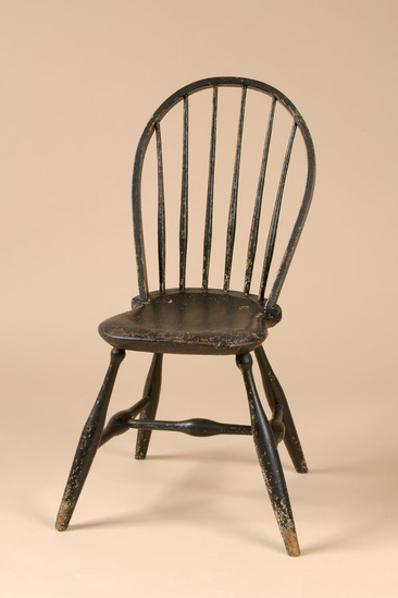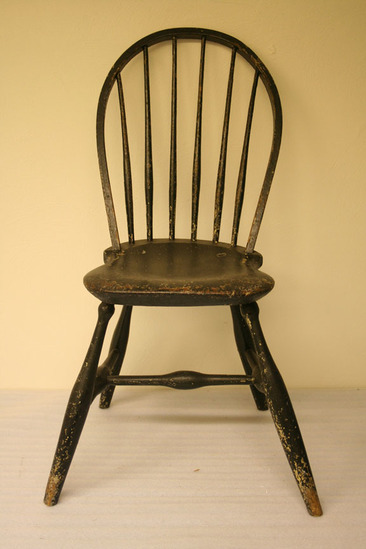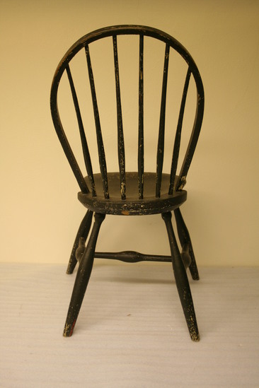 Hoop back Windsor chair. Round, elongated "bowling pin" legs with knob at top, canted. "H" shaped stretcher, bulbous in center. Long saddle seat with hoop back. Square profile, six round spindles with slight bulge 1/3 of the way up. Painted dark green/black. Remnants of label on back edge of seat.