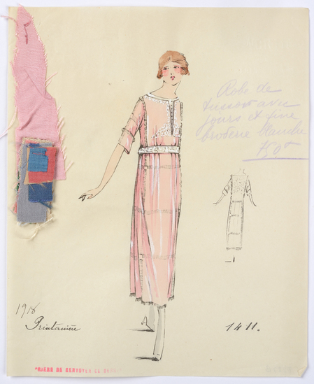 Lithograph and watercolor on paper fashion design. Dress of silk with delicate white needlework. Fabric samples accompany rendering.